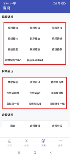 其中包含音视频剪切,音视频转码,音视频解码原始数据,音视频编码,视频转图片或gif,视频添加水印,多画面拼接,音频混音,视频亮度和对比度,音频淡入和淡出效果,视频倒放,视频去水印,视频去人声,音频去人声,伴奏提取,音频剪辑,B站视频合并等;
