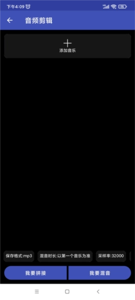 2、拿音频剪辑为例子,点击进入,选择添加音乐,然后选择手机中的本地音频文件。