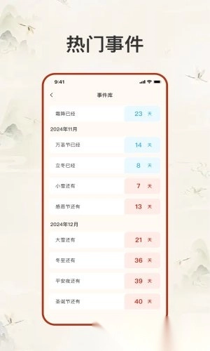 软件了全年重要节日的自动记录功能,涵盖冬至、圣诞节、万圣节等,无需手动添加即可随时查看。
