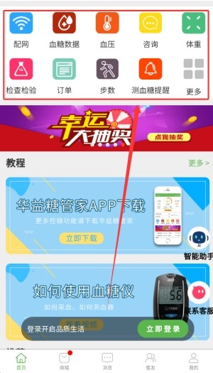 3、首页集中呈现配网设置、血糖血压数据、健康咨询、体重信息、检验订单以及步数记录。