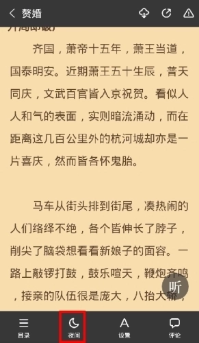 1、在小说阅读界面的中心位置轻点一下,周围会弹出工具栏,点击下方的“夜间”功能,就能把背景切换成暗色系,再次点击该功能则会恢复原来的背景。
