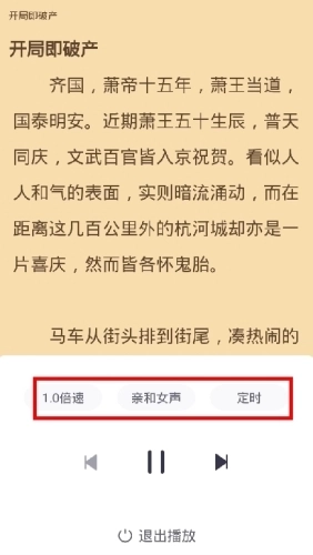 2、再次点击中心区域,即可调整听书的播放倍速、音量大小以及定时时长。