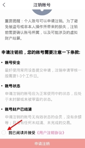 2、点击操作后会弹出二次确认注销的提醒窗口,同时会向用户告知注销前需要留意的各项注意事项。待用户确认所有信息无误后,勾选下方的同意协议选项,再次提交注销申请即可完成操作。