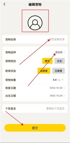 3、编辑你宠物的相关信息,比如头像、名字、品种、体重之类的内容。