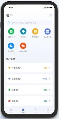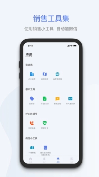 4、高效销售工具:支持批量添加微信好友,配备智能电子名片功能,助力优化销售流程效率,加速推动业绩目标达成。