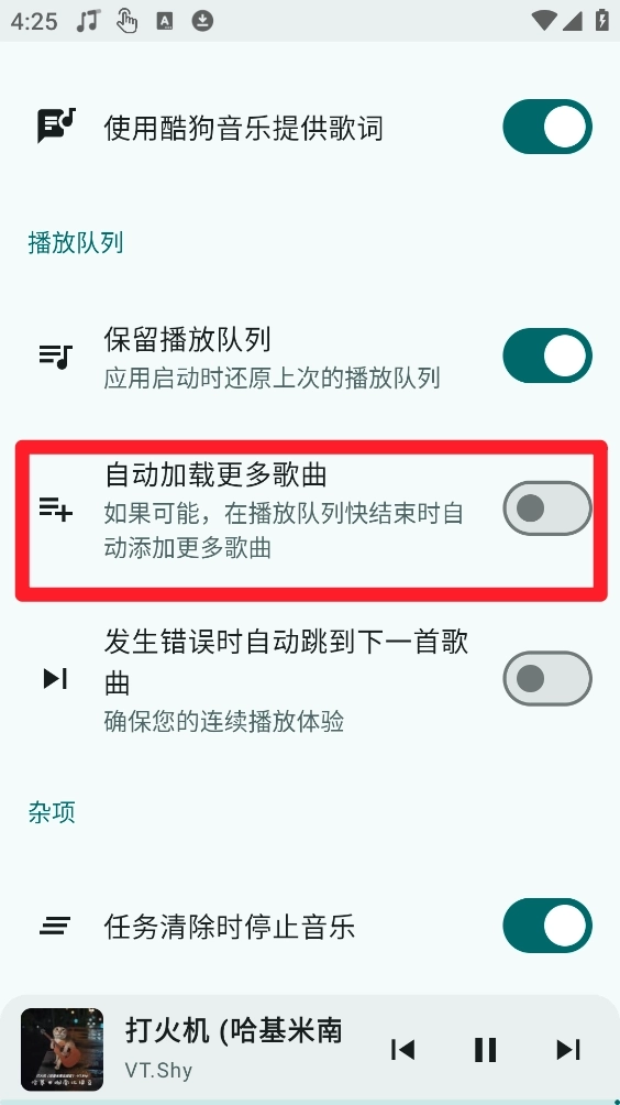 3、进入后向下滑动,开启自动加载更多歌曲的开关就可以了。