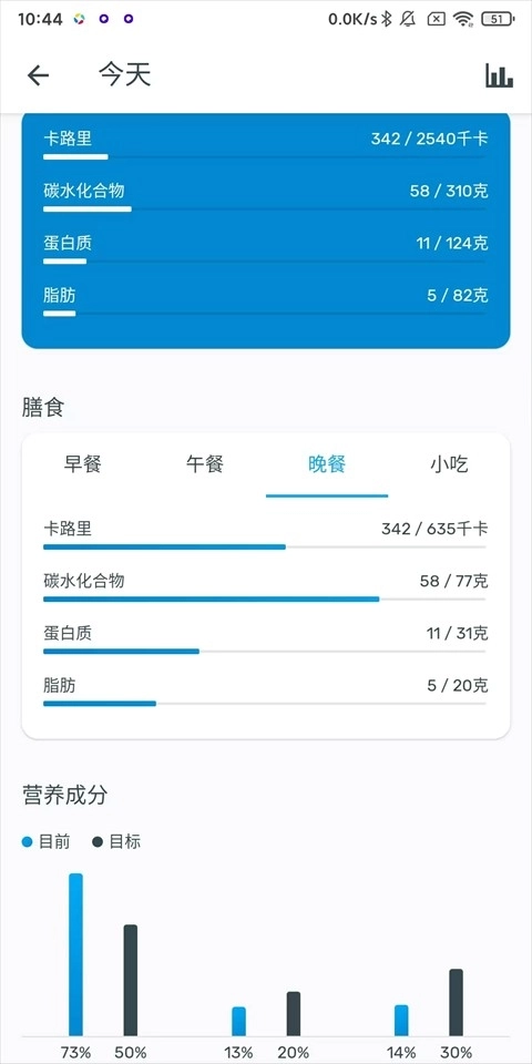 以营养成分为核心的精细化饮食记录:应用的核心是详细记录每日摄入。它不仅记录总卡路里,更深入追踪 “碳水化合物、蛋白质、脂肪”三大宏量营养素 的摄入量与目标比例(如117/193克)。每餐的卡路里进度会以环形图直观展示,让营养平衡一目了然。