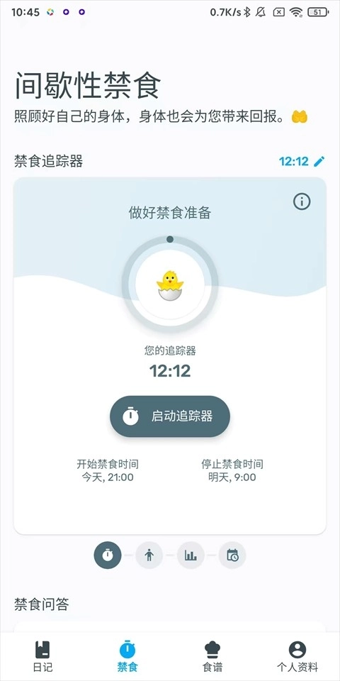 集成的“间歇性禁食”计时与追踪工具:应用了流行的间歇性禁食追踪器。用户可以选择如“16:8”等模式,应用会以大号计时器动态显示当前的禁食时长,并清晰标注禁食与进食的起止时间,帮助用户规律执行禁食计划。