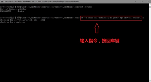 10、待手机设备连接完成后,输入“.adb -d shell sh /data/data/me.piebridge.brevent/brevent.sh”即可完成授权操作。