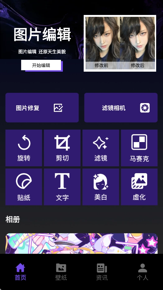 首页整合了多种实用的图像处理工具,包括对图片瑕疵进行修复、模拟滤镜相机效果、调整画面角度、裁剪画面尺寸、添加风格化滤镜以及用马赛克遮挡隐私区域等功能。