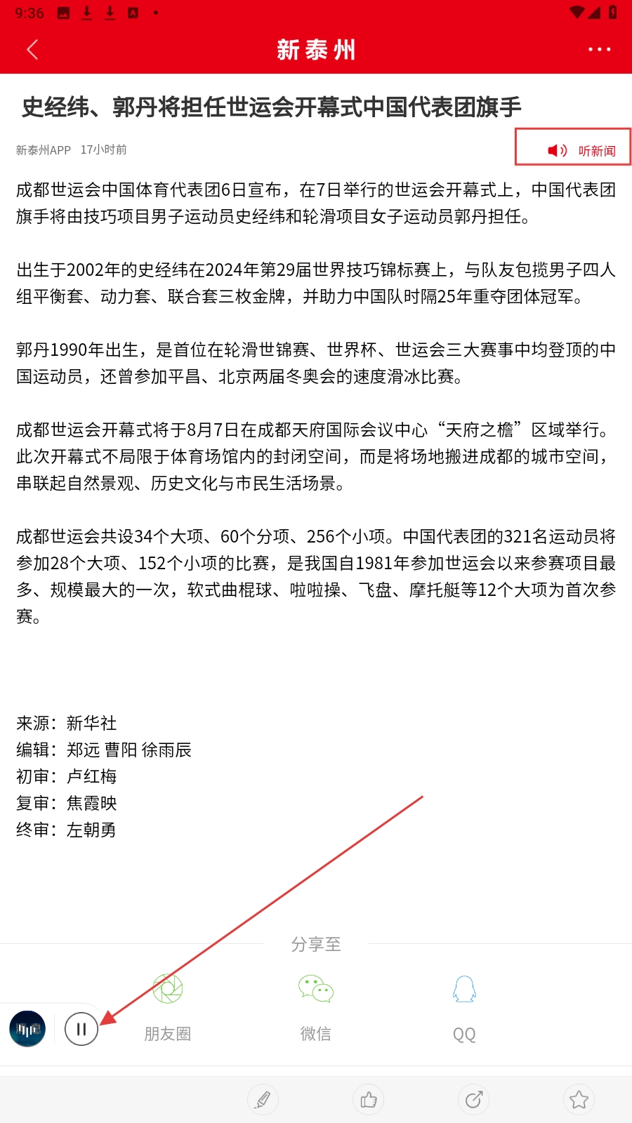 3、点击【听新闻】按钮,即可收听新闻的语音播报,点击暂停键便可停止。
