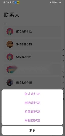 7位好友添加成功后,长按好友图标,即可对该好友进行备注、删除、拉黑或举报操作。