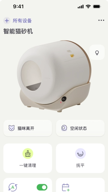 可以远程操控猫砂盆,实现一键清理、抚平和换砂功能,猫咪与猫砂盆的所有状态都能在端上实时查看。