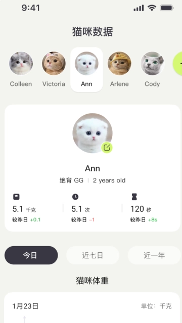 持续追踪猫咪的体重变化与如厕时长,按周期推送相关数据,并支持多只猫咪的身份区分功能。