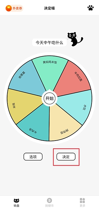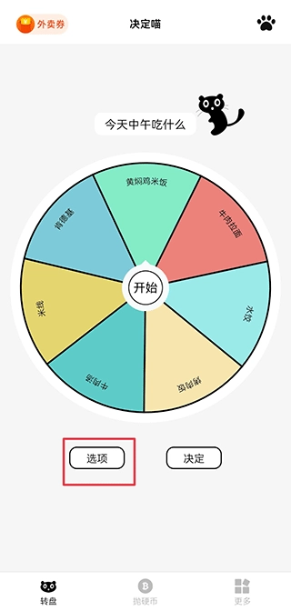 1、打开决定喵,在转盘界面中点击选项