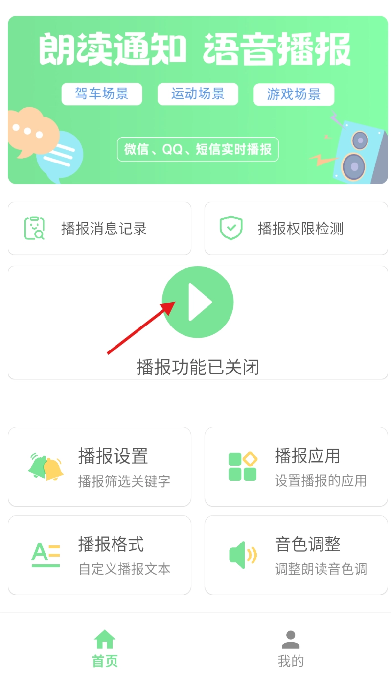 要开启通知的语音播报功能,可在应用的主页面中找到带有播放标识的图标并点击它。