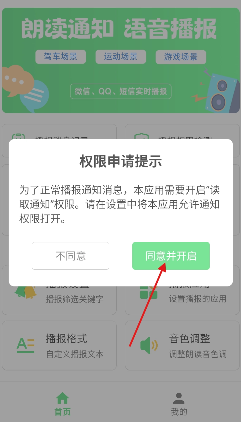 当系统弹出权限申请通知时,选择点击 “同意并开启” 选项即可完成授权操作。