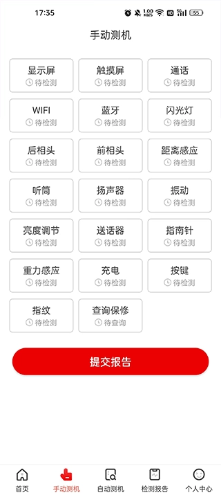 2. 点击“手动测机”,挑选你手机可使用的功能,随后点击“提交报告”。