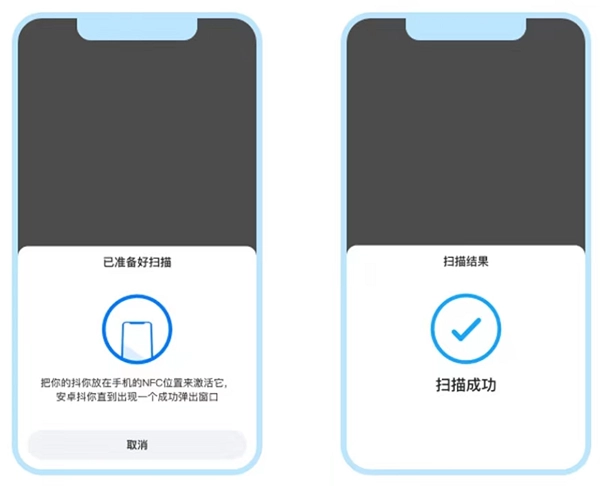 4、当扫描弹窗准备好出现后,把您的Dtap放置到手机的NFC感应区域,等待扫描成功提示出现,这样就可完成绑定。