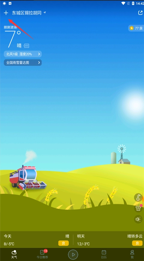 首先我们打开天气预报在首页点击左上角的加号;