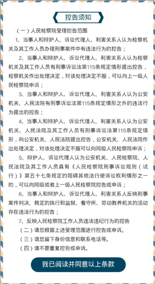 就拿“控告”来说,认真研读“控告须知”,在确认没有问题之后,点击“我已阅读并同意以上条款”。