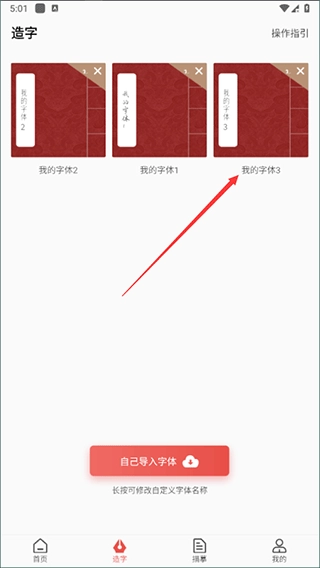 1. 开启书法练字帖软件,进入首页后,点击横幅或者“造字”选项,从而进入字体页面。