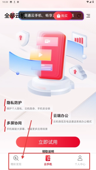 启动联通云手机相关应用后,在界面底部找到“精彩发现”的入口并点击,即可跳转至对应的页面。