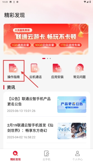 你可以在精彩发现页面找到操作指南的入口,通过它来了解联通云手机的具体使用方法。