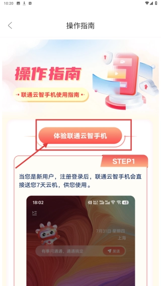 在操作指引界面,找到并点击“体验联通云智手机”的功能入口,即可启动云手机服务的试用流程。