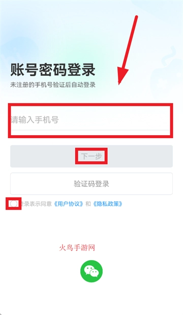 请先填写您的手机号码,接着勾选登录前的同意选项以确认接受相关服务条款与隐私说明,之后点击进入下一步操作。