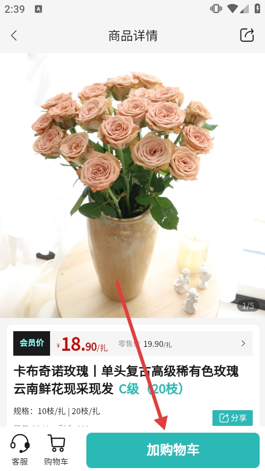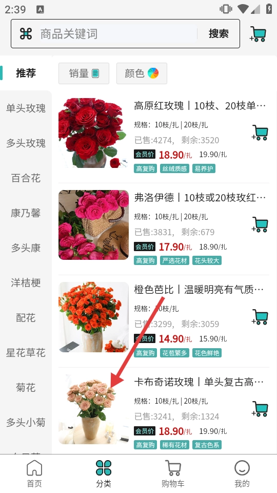 2. 在分类页面,选择【卡布奇诺玫瑰】,随后进入商品详情页面。