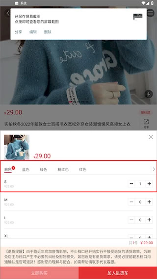 进入商品详情页面,能查看质量说明等详细信息,点击添加至进货清单。
