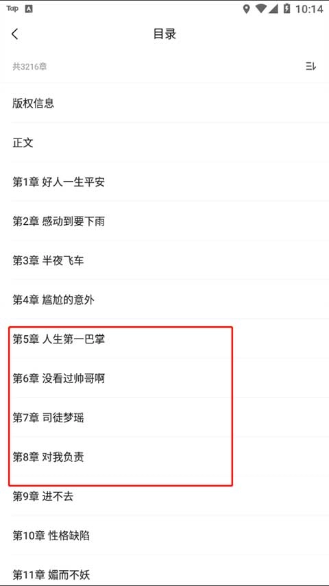 4、接着在此处,我们就能看到小说的所有章节。其中,章节颜色稍深些的,是已经缓存好的章节;颜色稍浅的,则是尚未缓存的章节部分。