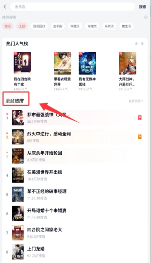 1. 开启飞读免费读书功能后,于首页顶端点击“热搜榜单”入口,便可查看当下热门小说的排行情况。