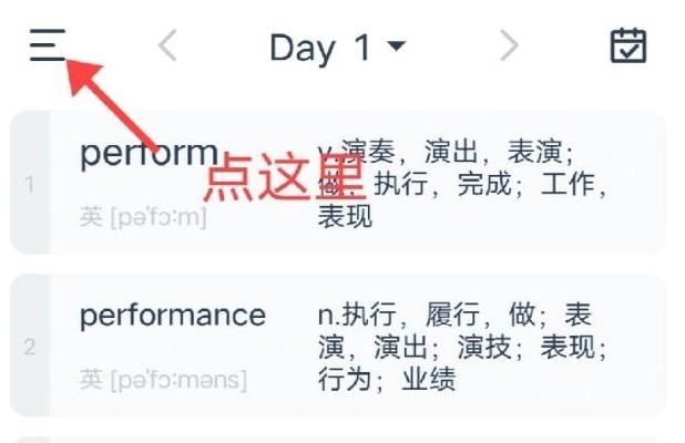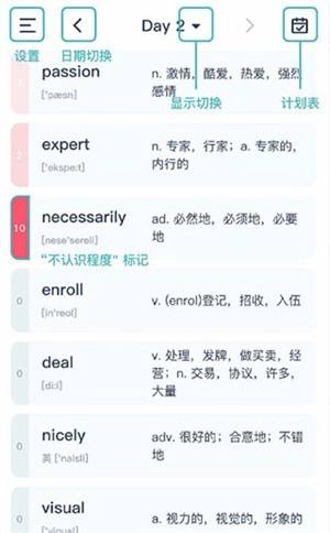 学习页面进入Day2后,页面中间会展示当前List包含的全部单词,具体呈现效果可参考图示。