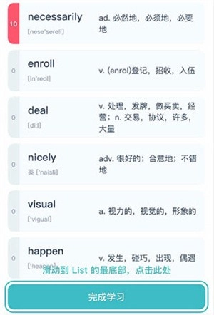 每完成一个List的学习,可点击该List底部的“完成学习”按钮(如下图所示),以此完成打卡记录。