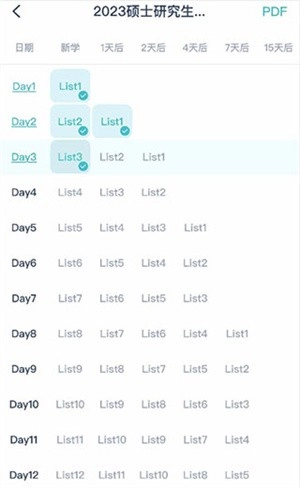 学习计划清单里,每一天的单词学习都包含记忆新单词和复习旧单词这两个环节。只有把当天的记忆任务和复习任务都完成了,才能够开启下一天的学习。清单中打勾的标记,代表对应的记忆或复习任务已经完成。就像下面的示例图所展示的那样,Day3已经顺利完成了list3的记忆任务,但还需要把list1和list2的复习任务完成,之后才可以进入Day4的学习阶段。
