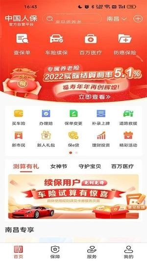 首页提供多种服务功能,包括保单查询、百万医疗险购买、车险续保以及防癌险购买等。