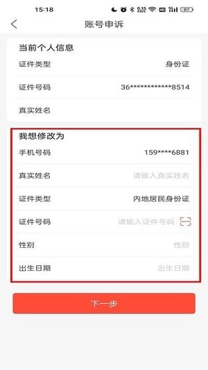 填写您需要修改的身份证信息,接着点击下一步,按照身份认证流程完成人脸识别操作就可以了。