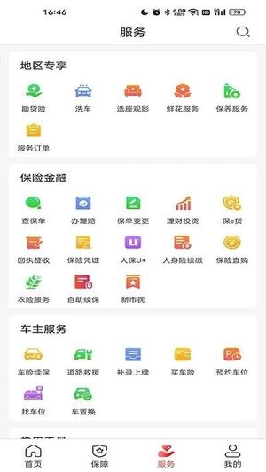 服务涵盖地区专享、保险金融、车主服务、常用工具、大众生活、就诊服务、健康管理以及养老金专区等内容。