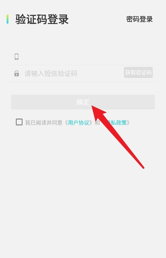 验证码登录页面需先输入手机号和短信验证码,勾选协议后按钮才会变为可点击状态。