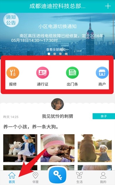 点击下方的邻里图标进入邻里圈,就能查看社区居民分享的动态以及大家的互动内容啦。