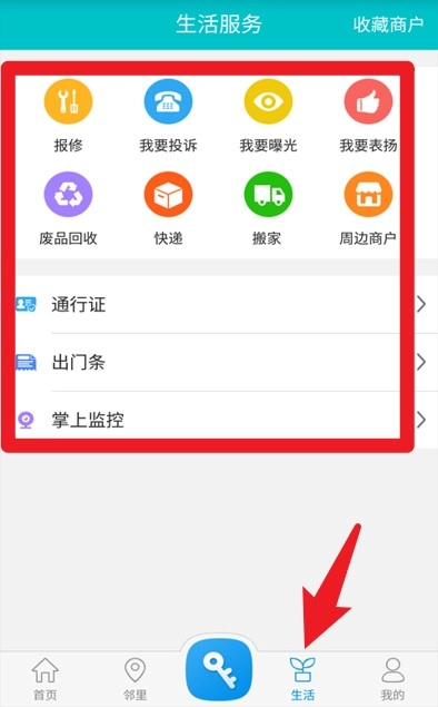 在首页功能区能看到报修、通行证、出门条以及商户等常用服务的入口图标。