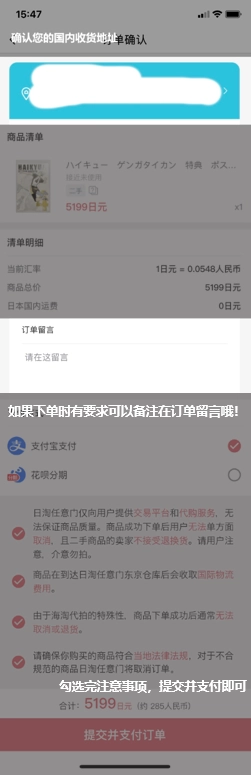第五步:把商品加入购物车后,页面会弹出购前注意事项(请大家务必仔细阅读),接着点击结算按钮,按照提示步骤填写完整收货地址,提交订单后再点击支付即可。
