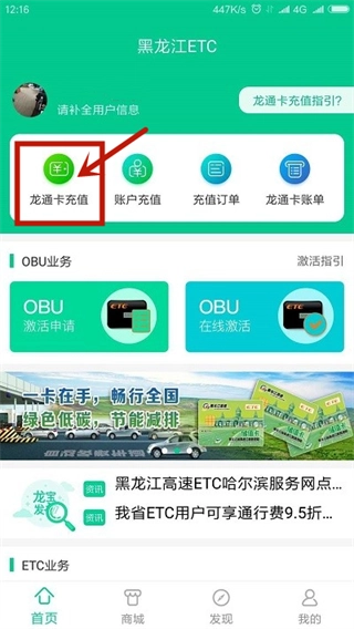 在主界面,我们可以点击“龙通卡充值”或者“账户充值”。