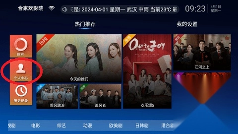 打开合家欢视频在首页点击中间的“个人中心”
