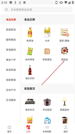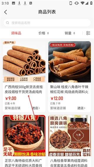 在【分类】页面,点击【调味品】选项就能进入商品列表页面。