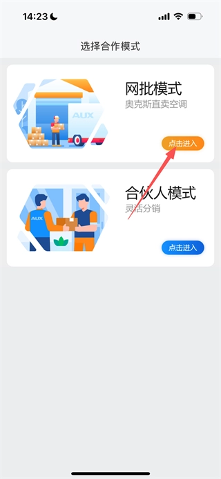 在选择合作模式的页面中,找到网批模式对应的“点击进入”按钮并点击,即可进入登录页面。