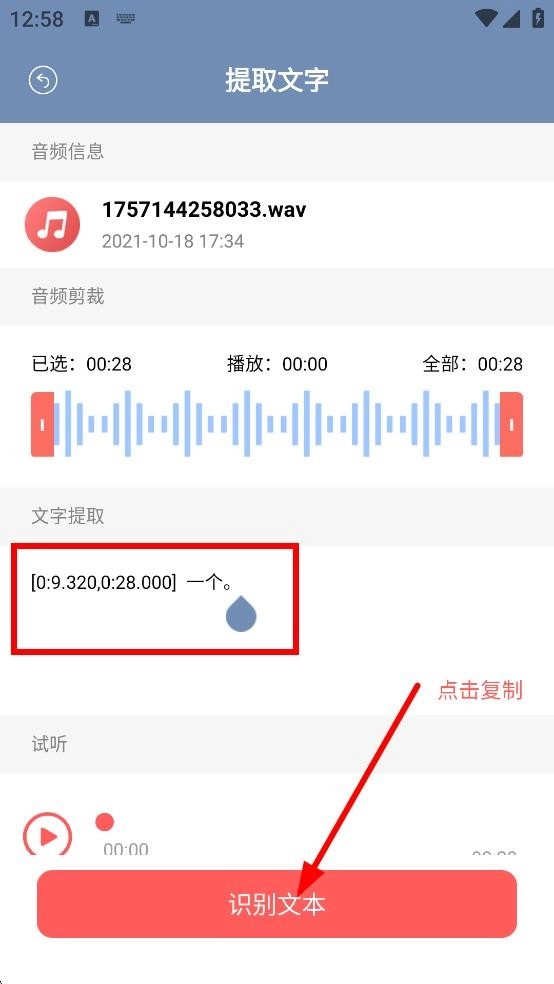 授权后选择音频,点击识别文本,提取音频中的文字。