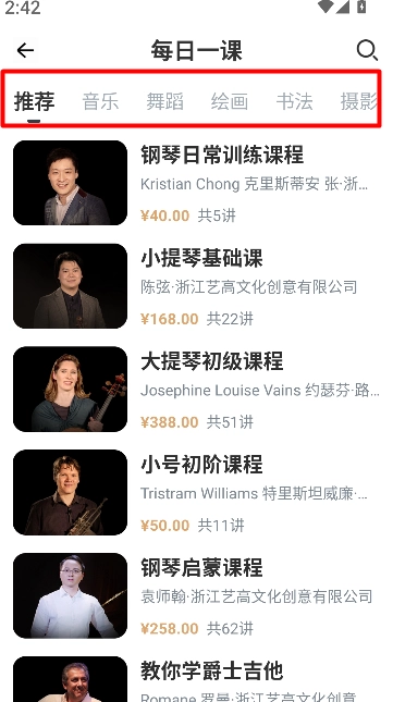 课程分类清晰明确,依据艺术类型对内容进行划分,能够帮助学习者更便捷地进入目标学习方向。